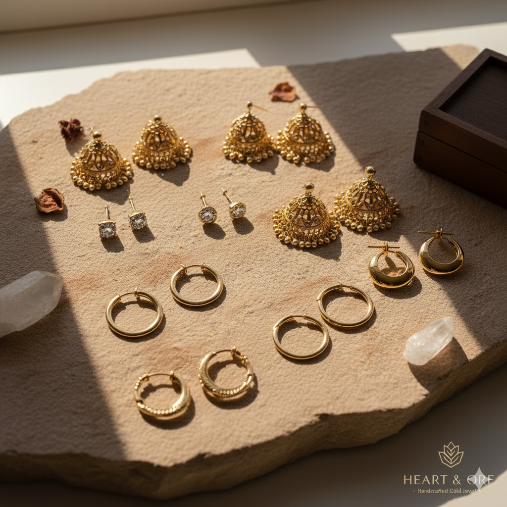 Perfect pieces of Studs, jhumkas, hoops & drop earrings in 22K pure gold.